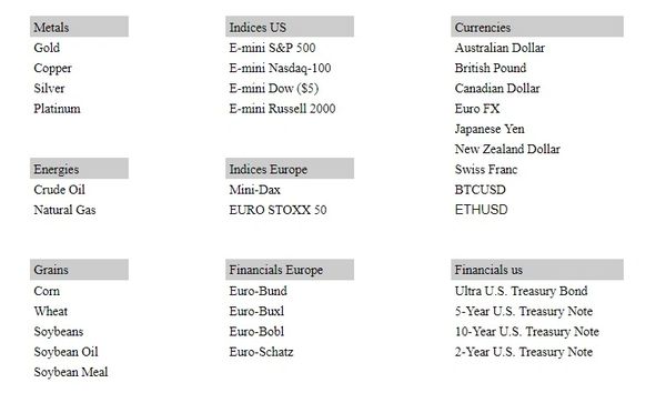 Although the actual list of tradable products and Exchanges is far and wide, Finance-Solutions typically trades only on EUREX and CME.